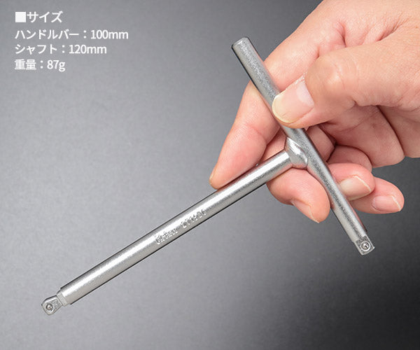 全長L1は120mm、全幅L2は100mmと手の中に収まりやすいサイズ感で、質量は約87g。携帯性にも優れており、持ち歩き用の工具セットや現場用のサブツールとしても使いやすい一本です。小さくても「できること」が多い、コーケンらしい機能派T型ハンドルです。