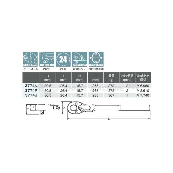 ■型式:3774N ■メーカー:ko-ken(コーケン/山下工業研究所) ■差込角:9.5sq.(3/8) ■ヘッド幅:30.5mm ■全長:265mm ■質量:378g
