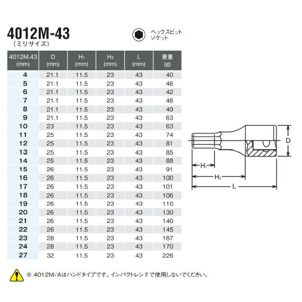 ■型式:4012M-43-19 ■メーカー:ko-ken(コーケン/山下工業研究所) ■差込角:12.7sq.(1/2) ■全長:43mm ■重量:110g