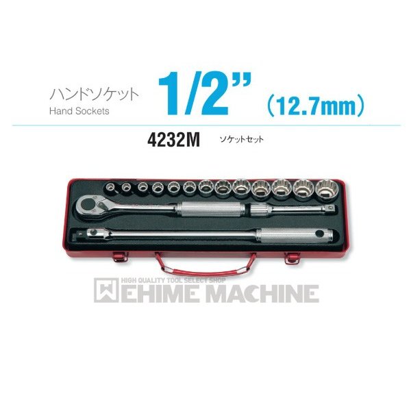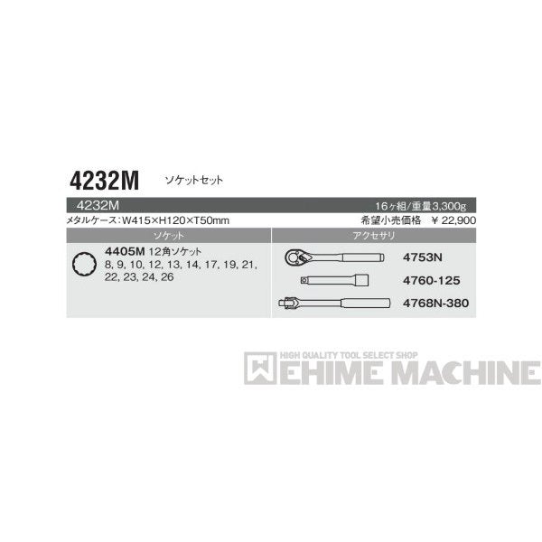 ■型式:4232M ■メーカー:ko-ken(コーケン/株式会社山下工業研究所) ■メタルケースサイズ:W415xH120xT50mm ■セット内容:16ヶ組 ・12角ソケット(4405M-8、9、10、12、13、14、17、19、21、22、23、24、26) ・ラチェットハンドル(4753N) ・エクステンションバー(4760-125) ・スピンナハンドル(4768N-380) ■差込角:12.7sq.(1/2) ■重量:3,300g