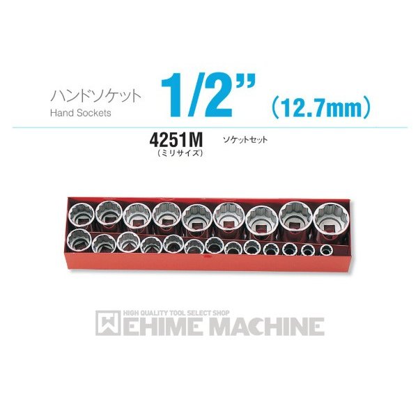 ■型式:4251M ■メーカー:ko-ken(コーケン/株式会社山下工業研究所) ■メタルケースサイズ:W330xH68xT48mm ■セット内容:22ヶ組 ・12角ソケット(4405M-10、11、12、13、14、15、16、17、18、19、20、 21、22、23、24、25、26、27、28、29、30、32) ■差込角:12.7sq.(1/2) ■重量:3,200g