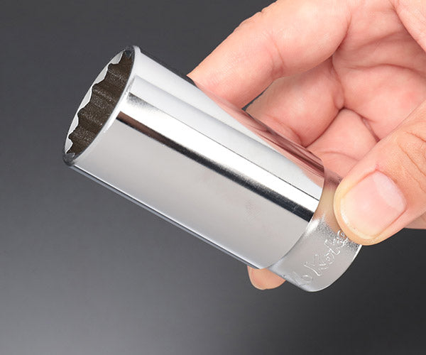 [フラットドライブ] 接触部の角を傷めない面接触形状は、ボルト/ナットに接する開口部と、ハンドル類との接合部となる四角の差込角の両方に採用。ボルト/ナットの角を傷めないのはもちろん、ソケットにかかる応力が分散されるため、耐荷重性もアップしています。