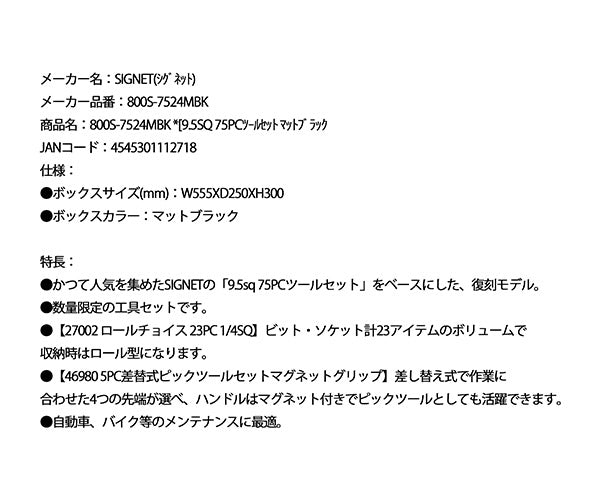数量限定で復刻。「9.5sq 75PC」をマットブラックツールボックスに収めたSIGNETツールセット。