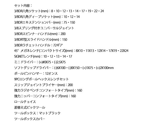 差込角9.5sq(3/8DR)を中心とした構成で、六角ソケット・ディープソケット・ラチェットハンドル・スピンナーハンドル・T型スライドハンドル・ユニバーサルジョイントを組み合わせて、エンジンルームから足まわりまで幅広いシーンで使えるバランスの良い内容になっています。45°メガネレンチやSIGNETレンチ、プライヤー類、ロングボールヘックスレンチ、ボールピンハンマー、各種ドライバーも揃い、これ一式で多くの作業をカバーできます。