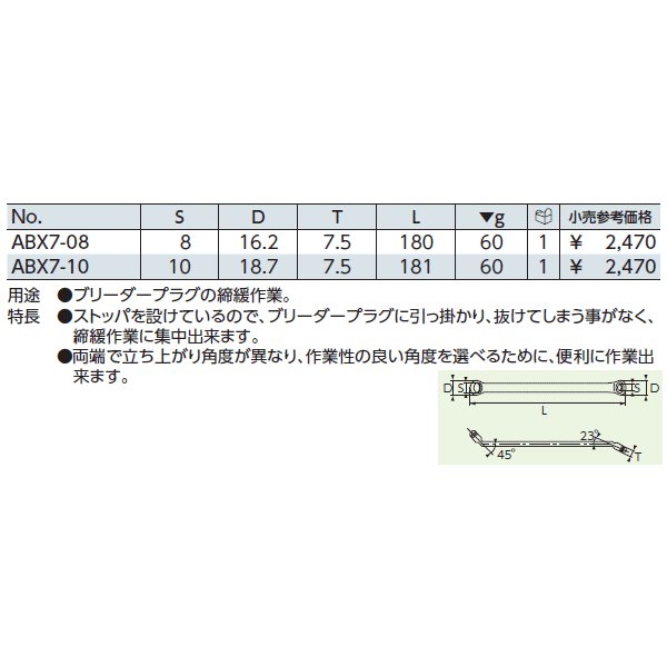 ●特長● ストッパを設けているので、ブリーダープラグに引っ掛かり、抜けてしまう事がなく、締緩作業に集中出来ます。 両端で立ち上がり角度が異なり、作業性の良い角度を選べるために、便利に作業出来ます。