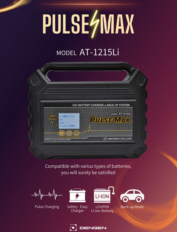 DENGEN AT-1215LI パルスマックス パルス充電器は、12Vの鉛バッテリーはもちろん、リン酸鉄リチウムイオンバッテリー(LiFePO4)まで幅広く対応する、ワークショップ向けの“マルチバッテリーケアマシン”です。