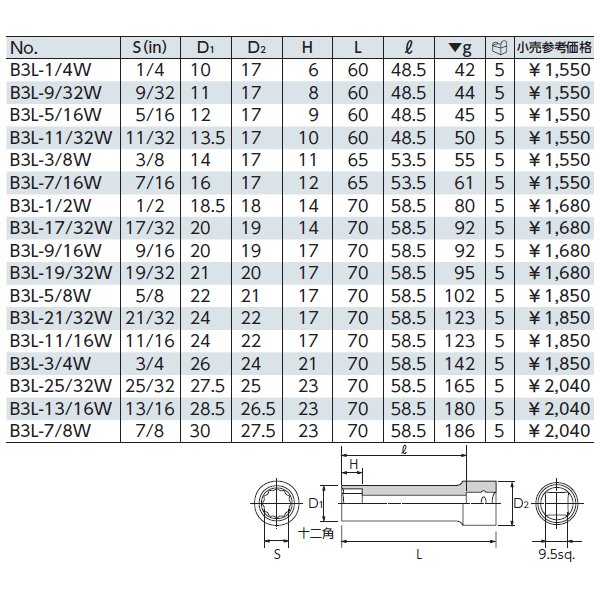 KTC B3L-17/32W インチサイズ17/32 9.5sq.十二角ディープソケット