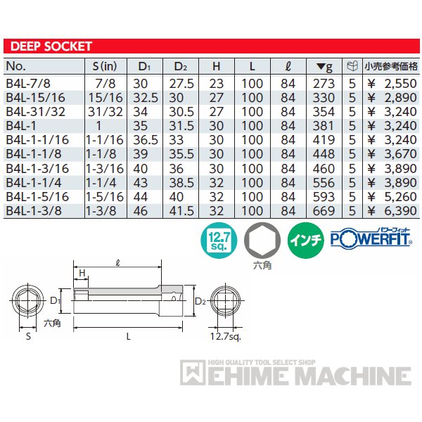 KTC B4L-1-1/8 インチサイズ1-1/8 12.7sq.六角ディープソケット