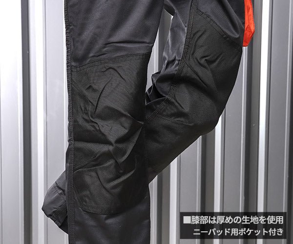 ひざ部には地面と接触する事を考慮し、厚めのポリエステル生地を使用したニーパッド用ポケットが備わっています。(膝が痛い場合は、このポケットに厚手の布地やスポンジ等を入れる事で、痛みが軽減できます。)