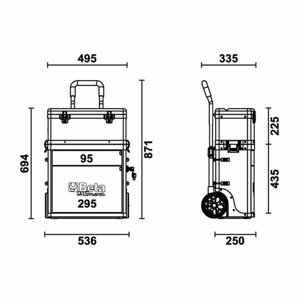 取り外し可能なモジュール2つ:上部ツールボックス1つ、引き出し2つ付きモジュール1つ (それぞれ高さ95 mmと295 mm)。