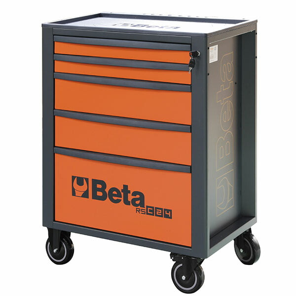 RSC24/5-O は、イタリア・Betaのストレージライン「RSC24」シリーズに属する5段ツールトロリーです。前面オレンジ×3面ダークグレーのカラーリングは、工場やガレージの中でひと目で自分のキャビネットが分かる視認性と、プロフェッショナルな雰囲気を両立。「大きすぎるキャビネットは置けないけれど、ちゃんとした1台が欲しい」という現場にちょうど良いバランスのモデルです。