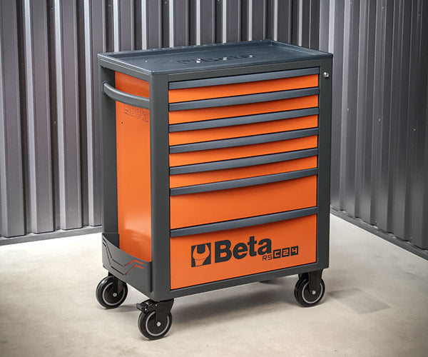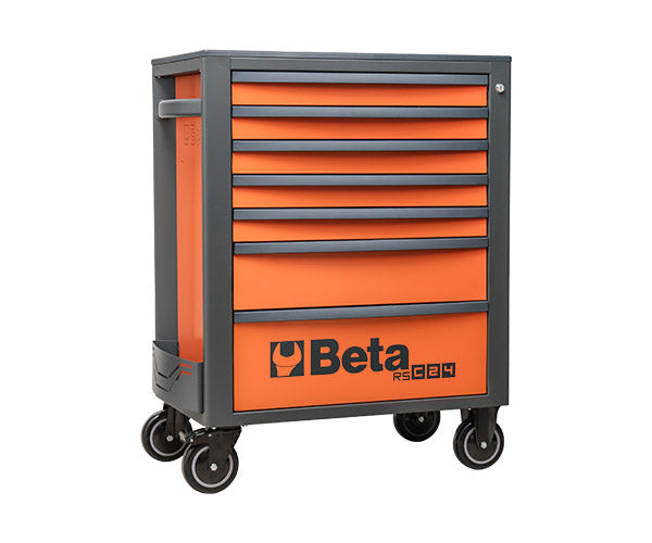 RSC24/7-FO は、イタリア・Betaのストレージライン「RSC24」シリーズに属する7段ツールトロリーです。4面すべてをベータオレンジで統一したカラーリングは、どの方向から見てもBetaそのもの。ガレージの中央に置いても、壁際に並べても、ひと目で「こだわって選んだキャビネット」だと分かる存在感があります。