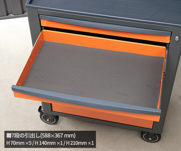 前面にはボールベアリング伸縮ガイド付きのフルオープン引き出しが7段(有効サイズ:588×367mm)。高さ70mmの浅型が5段、高さ140mmの中型が1段、高さ210mmの深型が1段という構成で、よく使うソケット・レンチ類は浅型に、ドライバー・プライヤーや測定器は中型に、電動工具やバッテリー、スプレー缶やボトル類は深型に、といった具合に整理しやすくなっています。