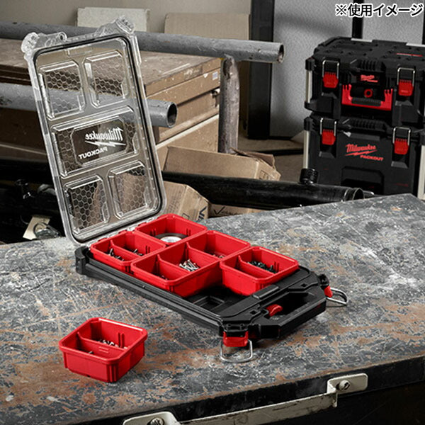 ミルウォーキーのPACKOUT(パックアウト)は、全ユニットを積み重ねて一体運用できるモジュラー収納システム。小物や消耗品、ビス類、端子類などをまとめて車載・現場持ち込みしたい方に最適な、薄型ロープロファイルのSサイズです。