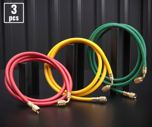 チャージングホースの3本セット(赤・黄・緑)です。 赤: 長さ:1.6m ホース・口金サイズ:ストレート側・7/16-20 UNF 虫なし、L側・7/16-20 UNF 虫付き 高圧用