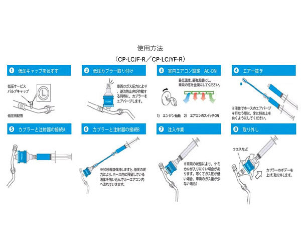 デンゲン CP-LCJYF-R は、冷房性能強化剤「クールフラッシュセット(CC-CF6S)」を自動車のエアコンに注入する際に使用する、R1234yf冷媒専用の低圧側ケミカルジョイントです。