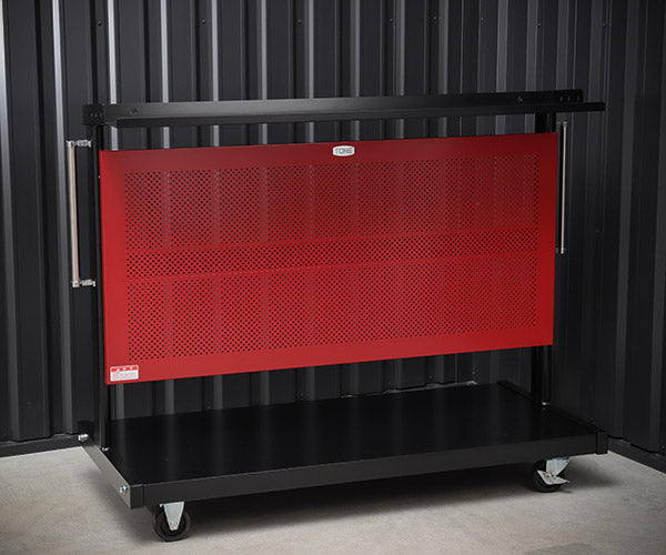 移動可能なキャスターと有孔ボードを備えた機能的なサービスボード取付専用キャリーです。