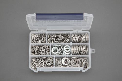 ●<セット内容>呼(入数)/内径×外径×厚み(mm):M6(120)/6.1×12.2×1.5M8(80)/8.2×15.4×2M10(50)/10.2×18.4×2.5M12(30)/12.2×21.5×3M14(20)/14.2×24.5×3.5M16(20)/16.2×28×4M18(10)/18.2×31×4.6M20(8)/20.2×33.8×5.1●材質…ステンレス●ケースサイズ…205×145×40mm