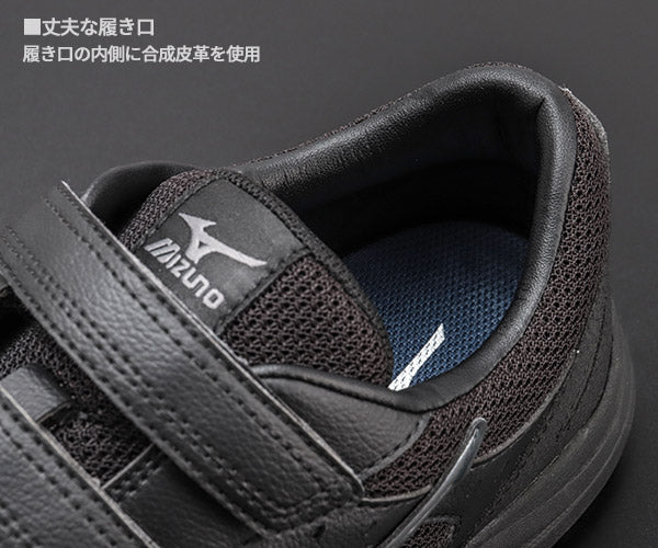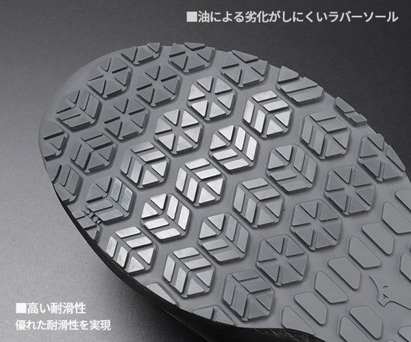 快適性能も充実しています。ミッドソール全体に搭載された「ミズノエナジー」が優れたクッション性と反発力を発揮し、長時間の作業でも足への負担を軽減。靴底は耐油配合の滑りにくいゴムソールで、かかとやつま先など擦り減りやすい部分はラバー厚めの偏肉構造でしっかり補強しています。つま先を上げたトゥアップ設計により、小さな段差につまずきにくく安全性もアップ。先芯には軽量な樹脂製を採用(JSAA A種認定)し、つま先をしっかり保護しながら靴全体の軽量性も確保しています。アッパーには耐久性に優れた人工皮革と通気性のあるメッシュ素材を組み合わせ、スポーツシューズ由来のテクノロジーで耐久性・通気性・屈曲性も抜群です。