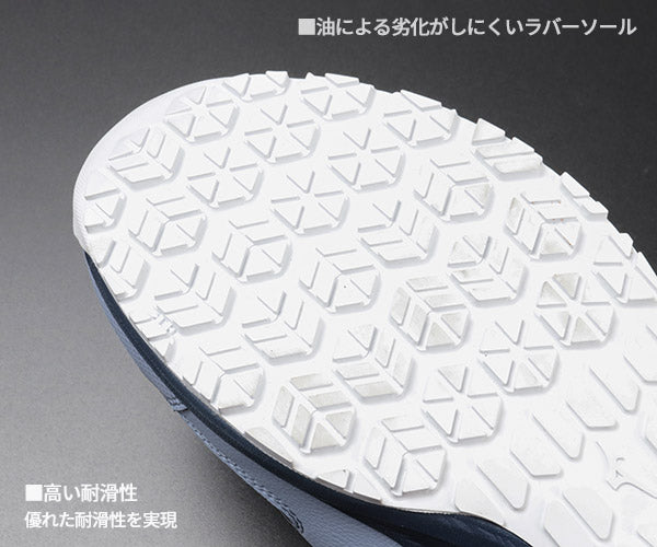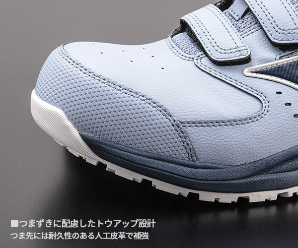 快適性能も充実しています。ミッドソール全体に搭載された「ミズノエナジー」が優れたクッション性と反発力を発揮し、長時間の作業でも足への負担を軽減。靴底は耐油配合の滑りにくいゴムソールで、かかとやつま先など擦り減りやすい部分はラバー厚めの偏肉構造でしっかり補強しています。つま先を上げたトゥアップ設計により、小さな段差につまずきにくく安全性もアップ。先芯には軽量な樹脂製を採用(JSAA A種認定)し、つま先をしっかり保護しながら靴全体の軽量性も確保しています。アッパーには耐久性に優れた人工皮革と通気性のあるメッシュ素材を組み合わせ、スポーツシューズ由来のテクノロジーで耐久性・通気性・屈曲性も抜群です。