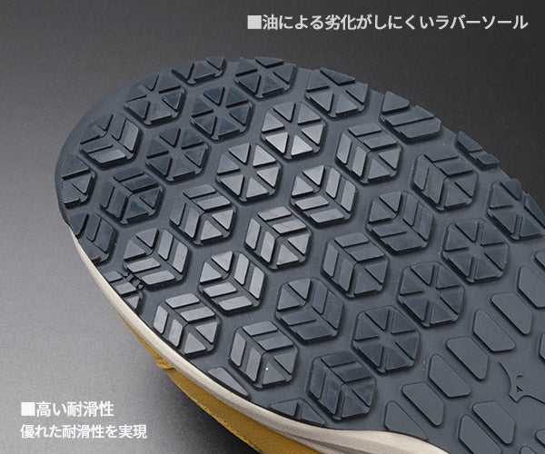 快適性能も充実しています。ミッドソール全体に搭載された「ミズノエナジー」が優れたクッション性と反発力を発揮し、長時間の作業でも足への負担を軽減。靴底は耐油配合の滑りにくいゴムソールで、かかとやつま先など擦り減りやすい部分はラバー厚めの偏肉構造でしっかり補強しています。つま先を上げたトゥアップ設計により、小さな段差につまずきにくく安全性もアップ。先芯には軽量な樹脂製を採用(JSAA A種認定)し、つま先をしっかり保護しながら靴全体の軽量性も確保しています。アッパーには耐久性に優れた人工皮革と通気性のあるメッシュ素材を組み合わせ、スポーツシューズ由来のテクノロジーで耐久性・通気性・屈曲性も抜群です。