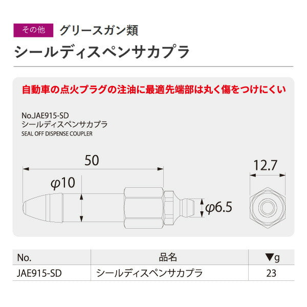 グリースのロスを削減するロックカプラ(JAE915)またはロックカプラ(ロングタイプ)(JAE915L)専用。 グリースガン用カプラセット(JAE5K)の補給部品。 自動車の点火プラグの注油に最適です! 先端部は丸く傷をつけにくい仕様になっています。 【仕様・規格】 ■メーカー:KTC ■品番:JAE915-SD ■全長:50mm ■重量:23g