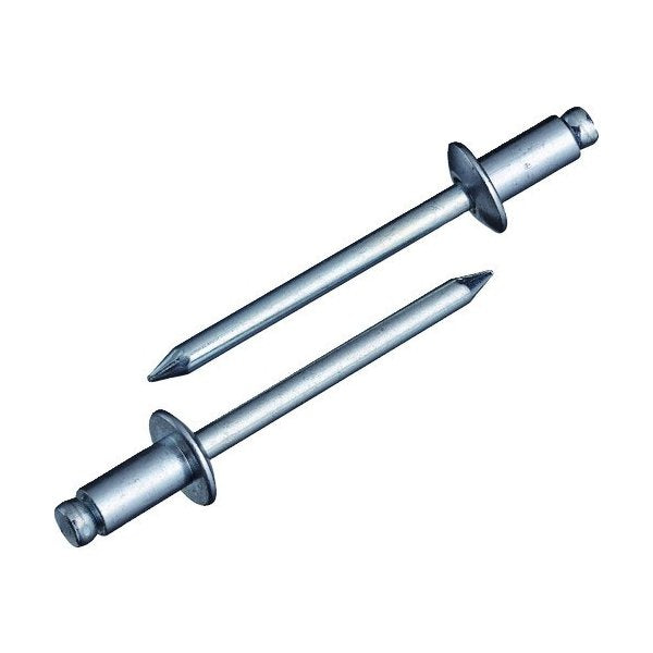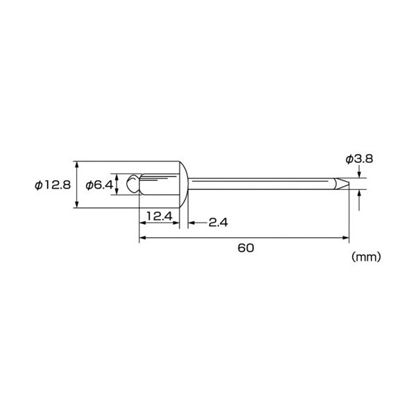 ■仕様: かしめ板厚(mm):3.2〜6.4 リベット長(mm):12.4 フランジ径(mm):12.8 リベット径(mm):6.4 下穴径(mm):6.5〜6.6 せん断荷重(N):5200 引張荷重(N):7200 頭部径(mm) 箱入数(本)