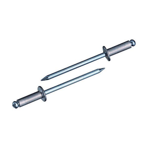 ■仕様: かしめ板厚(mm):3.2〜6.4 リベット長(mm):9.9 フランジ径(mm):6.4 リベット径(mm):3.2 下穴径(mm):3.3〜3.4 せん断荷重(N):960 引張荷重(N):1350 箱入数(本):1000