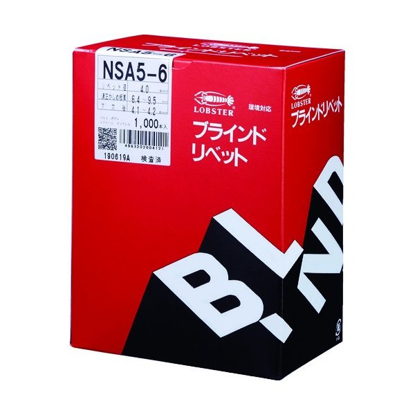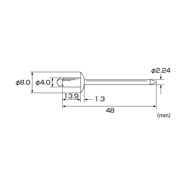 ■仕様: かしめ板厚(mm):6.4〜9.5 リベット長(mm):13.9 フランジ径(mm):8.0 リベット径(mm):4.0 下穴径(mm):4.1〜4.2 せん断荷重(N):1550 引張荷重(N):2200 箱入数(本):1000