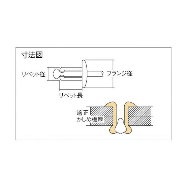 ■仕様: かしめ板厚(mm):4.8〜8.0 リベット長(mm):10.8 フランジ径(mm):6.4 リベット径(mm):3.2 下穴径(mm):3.3〜3.4 せん断荷重(N):2350 引張荷重(N):2700