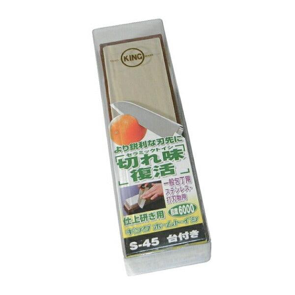 キング砥石 キングホームトイシ S-45 HT-43 176×52×15mm 一般家庭用です。 最高級研磨材を使用し、焼成製法により制作しておりますので硬度にムラがなく、長期間品質の変化もありません。 【用途】 仕上研ぎ用。 一般家庭包丁用。 より以上鋭利な刃先が必要な時に。 【仕様】 メーカー:松永トイシ 品番:0400372 粒度:#6000 長さ:176mm 幅:52mm 厚さ:15mm 材質:砥石 特殊砥材 質量:0.4kg ※ご使用時は順次水を補給しながら研いでください。