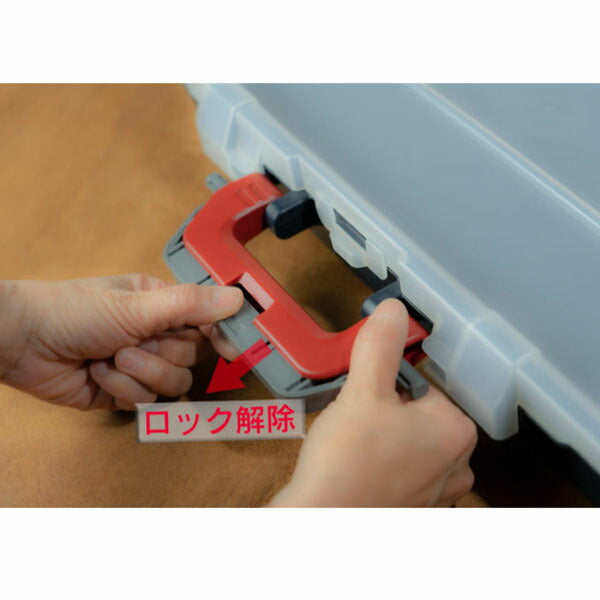 スライドロックシステム採用(特許取得):ハンドルをスライドするだけで簡単ロック。ロックのかけ忘れによる中身の飛び出しを防止します。