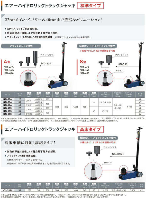 長崎ジャッキ NTJ-27S は、27t対応のエアートラックジャッキ(Sタイプ)です。