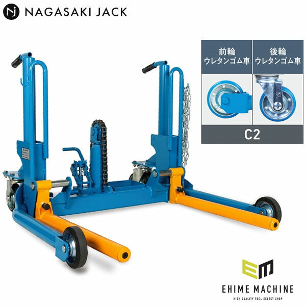 長崎ジャッキ NWD-500GRP-C2 は、足踏みペダル昇降機構と回転フォーク機構を備えた多機能型ホイルドーリー。C2仕様は前後輪ともにウレタンゴム車輪を採用し、床面への配慮と静音性を高めたタイプです。2t車~大型車まで幅広く対応し、重量タイヤの脱着作業を安全かつ効率的にサポートします。