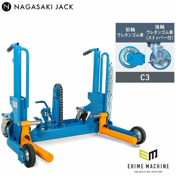 長崎ジャッキ NWD-S500GP-C3 は、2t車~大型車のタイヤ脱着作業に対応するショートタイプのホイルドーリーです。