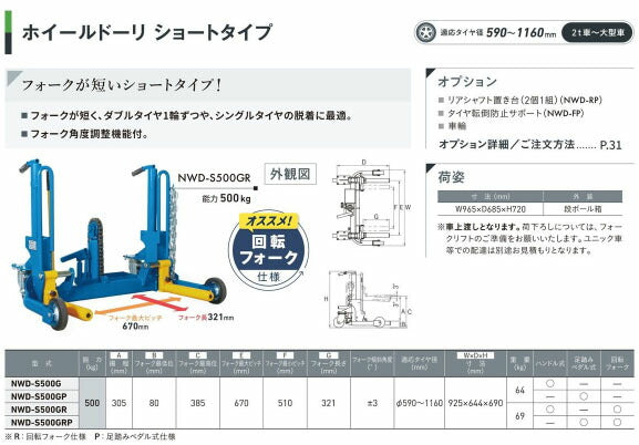 長崎ジャッキ NWD-S500GR-C1 は、2t車~大型車のタイヤ脱着作業に対応したホイルドーリーで、フォークが短く、ダブルタイヤ1輪ずつやシングルタイヤの作業に適しています。