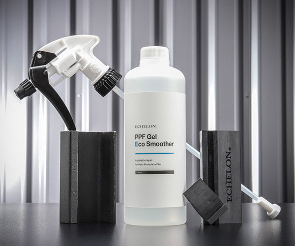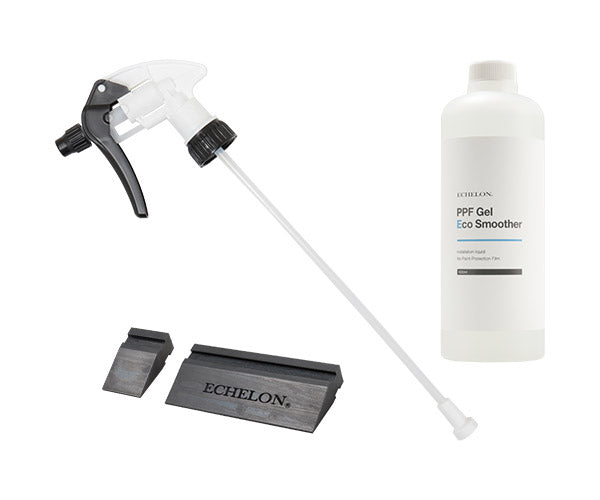 ECHELON(エシュロン)「導入施工ツールセット」は、カット済みヘッドライトプロテクションフィルム施工に必要なスキージ2種+施工液をひとまとめにしたスターターセットです。