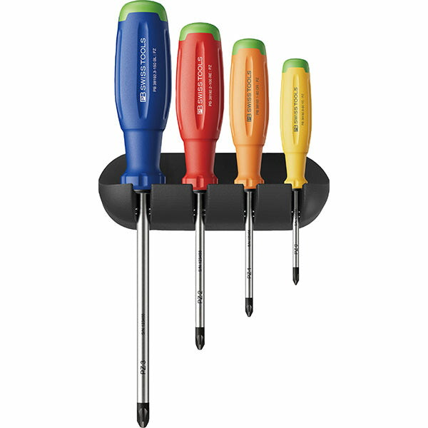 PBスイスツールズの「スイスグリップEVO」を採用したポジドライバー4本組を、ホルダー&外箱(BOX)付きでセット化。