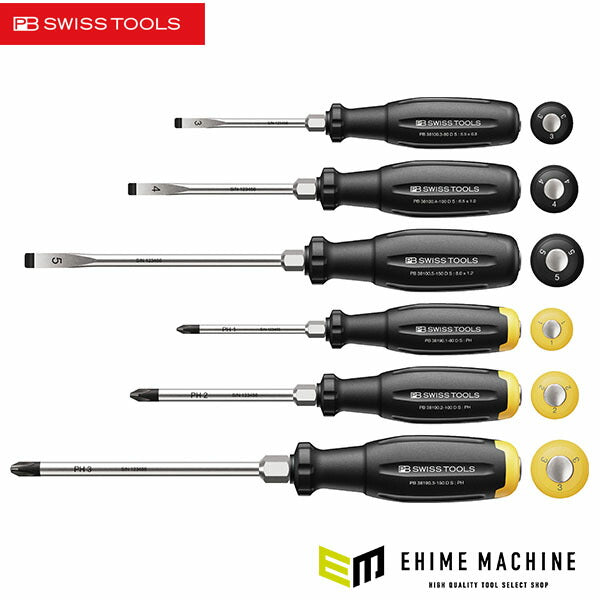 PB SWISS TOOLSのスイスグリップEVOに、打撃対応の貫通ブレードと根元六角を備えた6本組セット。