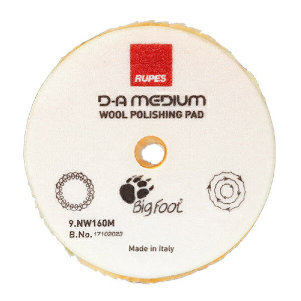 ウールバフ イエロー MEDIUM(傷消し~仕上)160φ ●デュアルアクションポリッシャーに最適なMedium Wool Polishing Padは、中程度のキズを除去するために設計 ●パッド表面に柔らかい15mmの繊維を均一に使用し、柔軟性の高いイエローフォームと組み合わせることで、曲線やエッジでのコントロールがしやすく、あらゆる塗装面でより繊細で優れた仕上がりを実現 【仕様】 メーカー:RUPES(ルぺス) 品番:R-WB-160-M マジック部直径:160mm バフ直径:160mm