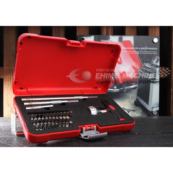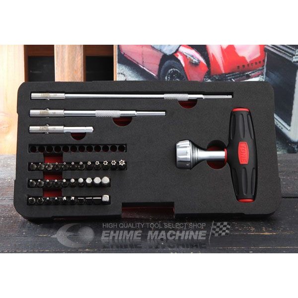 T型ラチェットドライバーのハンドルに差替式ビットホルダと、使用頻度の高いビットを付属したセットです。