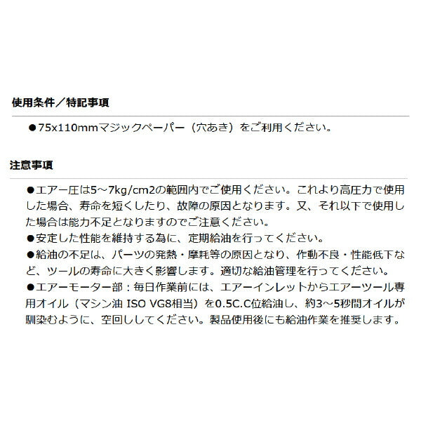 ※エアーモーター部:毎日作業前には、エアーインレットからエアーツール専用オイル(マシン油 ISO VG8相当)を0.5C.C位給油し、約3~5秒間オイルが馴染むように、空回ししてください。製品使用後にも給油作業を推奨します。