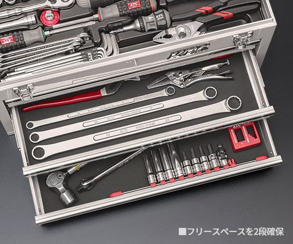 現場の声を反映し、試作と再配置を重ねて完成させたエヒメマシンのオリジナル入組み。 よく使う相棒はトップと一段目に集約。下二段はフリースペースで拡張に対応し、 トルクレンチやケミカル、コードレスラチェットレンチ(JTRE330)など小型電動工具の収納にも最適です。 レンチ4種と超ロングめがね、解決系プライヤ、ディープやビット、ハンマーまで網羅。 15mm 16mm 18mmもきっちり採用し、作業の立ち上がりを加速します。オフホワイトのSKX0213FWがガレージを明るく演出します。