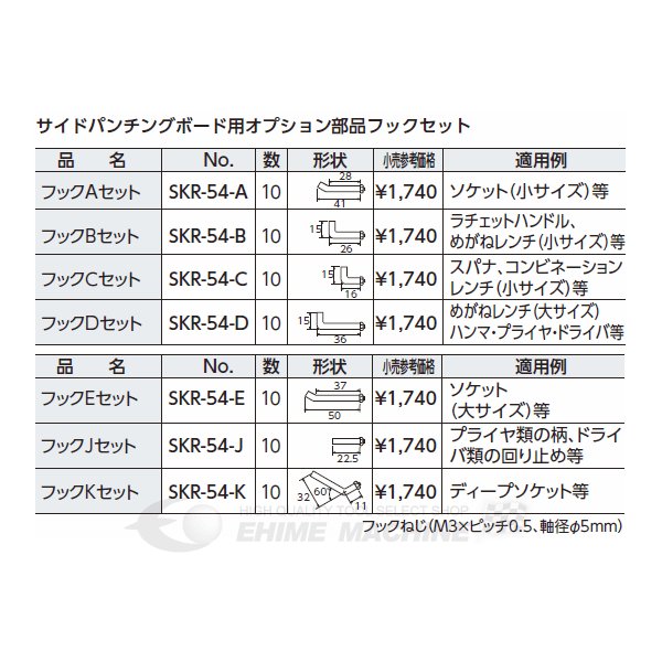 薄型収納メタルケース(EKS-101)やツールステーション(SKR502AおよびSKR602A)のオプション部品であるサイドパンチングボード(SKR-54S)に使用するフックセットです。