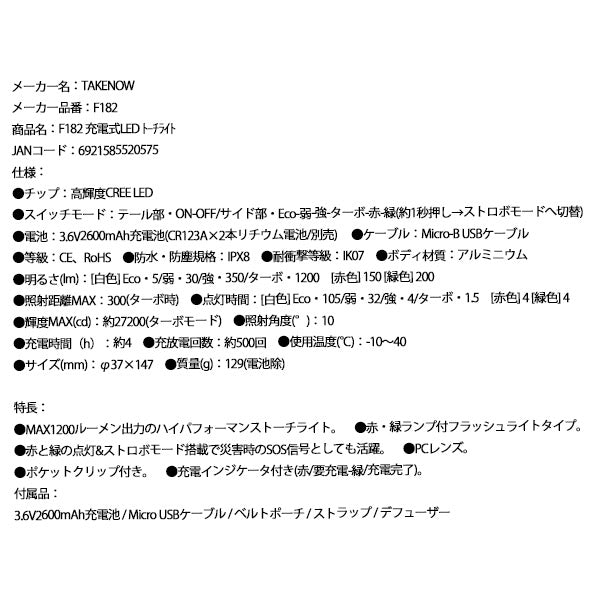 ●明るさ(lm):[白色] Eco・5/弱・30/強・350/ターボ・1200