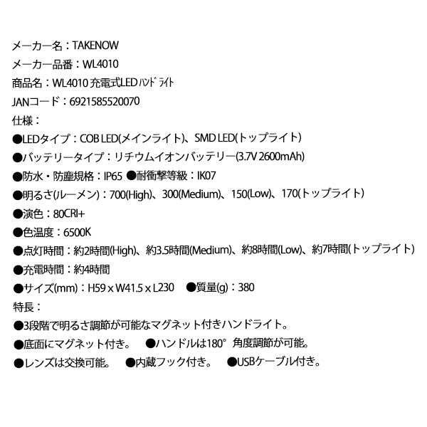 ●3段階で明るさ調節が可能なマグネット付きハンドライト。