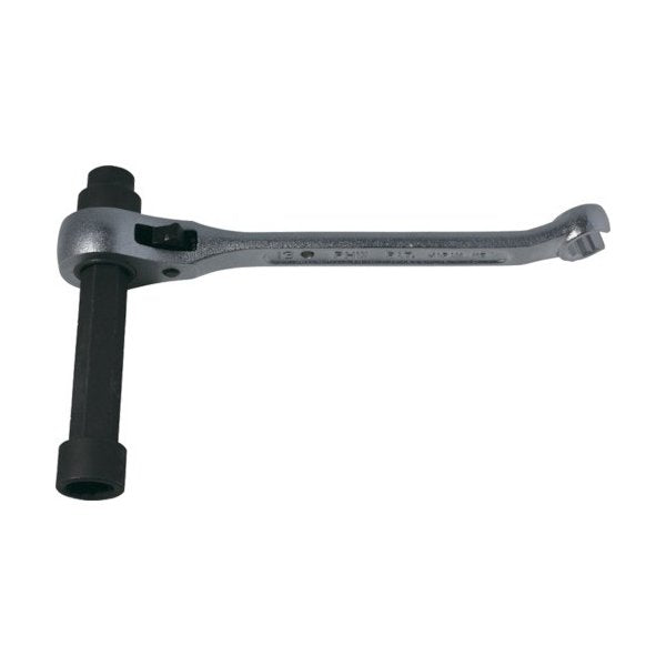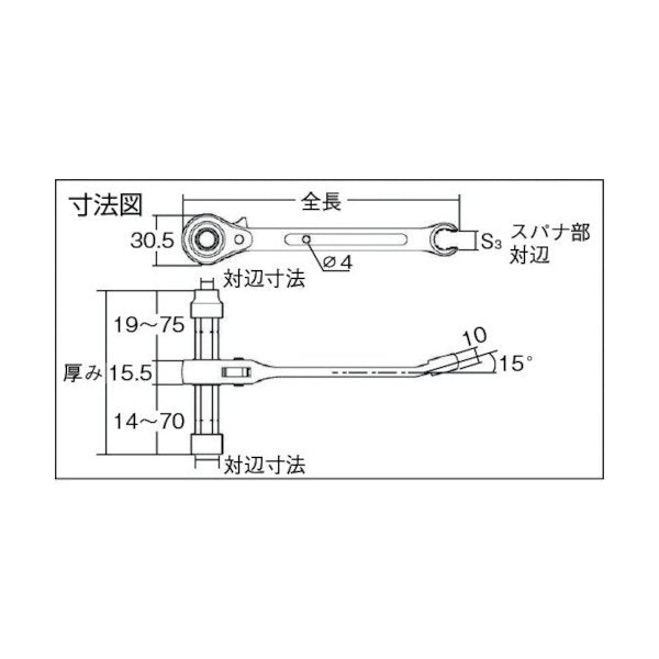 特長:先端めがね部は、タン付吊り金具の早回しに便利です。ナットにめがね部を差し込み、手を離してもレンチが落ちません。スライド式ロングソケット機能により、パイプに干渉することなく作業効率がアップします。各種配管バンド(100A・125A)のバンド締め、ダクト、電気の設備工事、ボルト着脱に適しています。込み入った配管作業も楽々です。