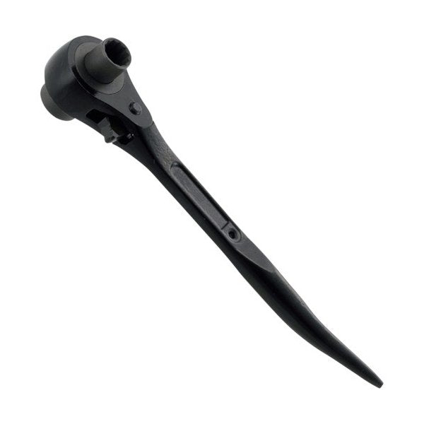 特長:正逆は切り替え爪式です。爪の切り替え部の開口が大きく泥水、砂などが入ってもすぐ排除されます。柄部のシノは鉄骨の穴合わせに便利です。安全ロープ取り付け穴を設けています。過酷な条件でも極めて安定したラチェット作動が得られます。