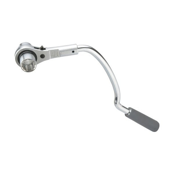 特長:水道本管のフランジボルト、ナットの締め付けに便利です。弓形ハンドルにより狭い管路も容易に締め付け可能です。埋設配管工事等の狭小スペースでも使い易い形状(掘削幅の制限、堀り直しの軽減に)隣接するナットに干渉しません。従来品に比べギア歯数2倍7.5度駆動です。細かいラチェット駆動で作業性がアップします。