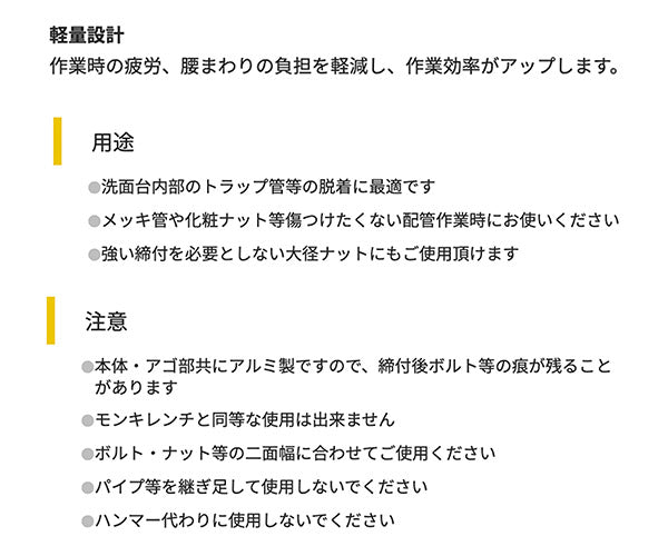 用途:狭い場所での配管継手の締め付けに。六角ボルト・ナットの組付けまたはその取り外しに。